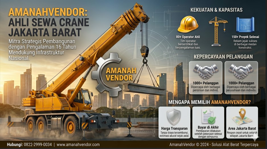 Sebagai penyedia layanan sewa crane Angke Jakarta Barat, AMANAHVENDOR menawarkan solusi yang lebih jelas dan profesional: